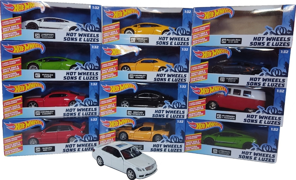 Miniatura na escala 1:32, aproximadamente 12cm, ou seja são maiores que os tradicionais Hot Wheels que vem na escala 1:64.