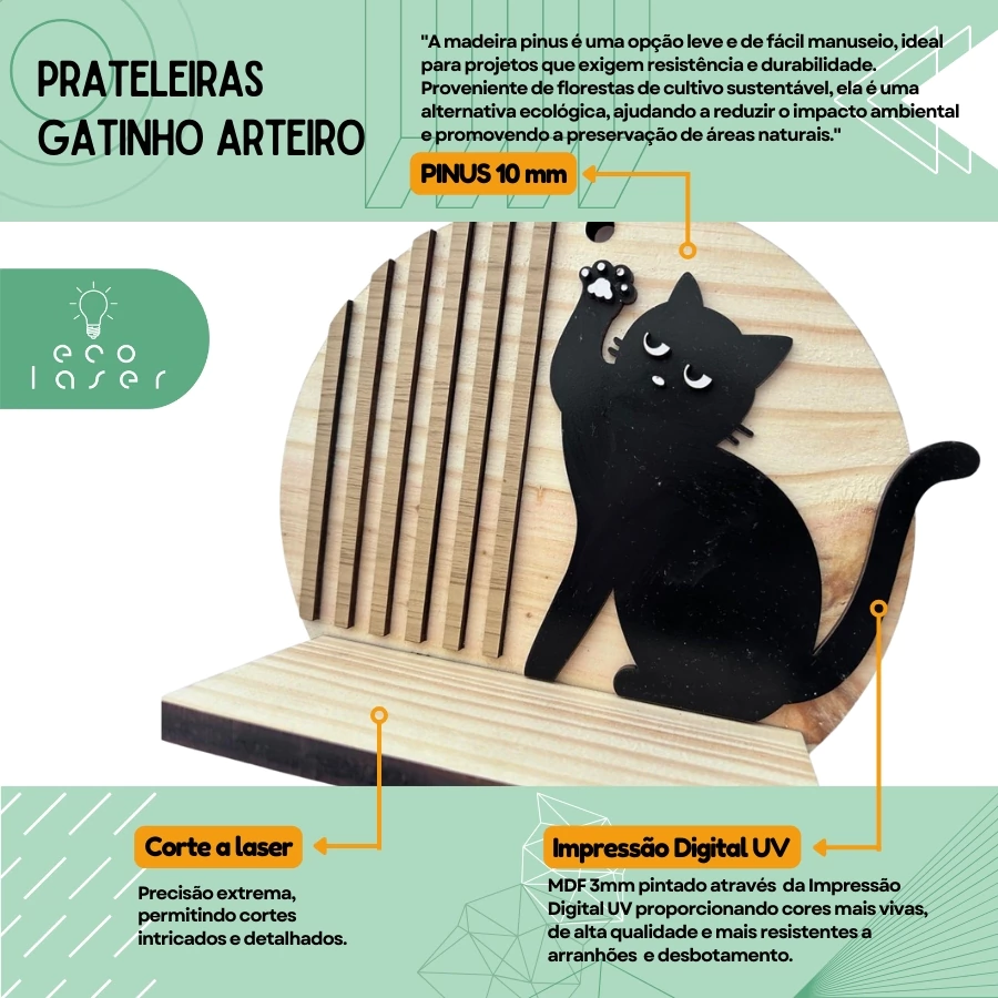 As Prateleiras Gatinho Arteiro são peças decorativas produzidas em PINUS 10 mm de alta qualidade, combinadas com detalhes em MDF 3 mm com impressão digital UV. Cada prateleira possui um gatinho em uma pose diferente, criando uma coleção divertida e moderna para decorar qualquer ambiente.